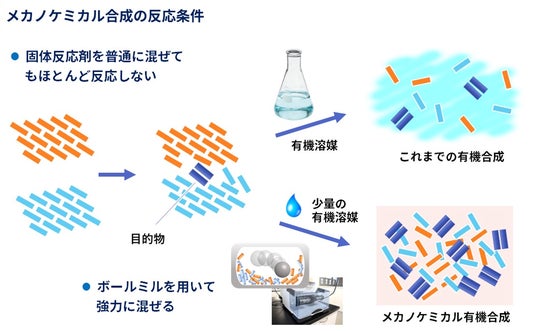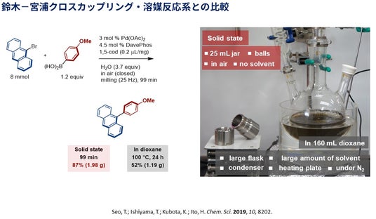 メカノケミカル有機合成は、医薬品の合成や化学材料の合成に用いられるカップリング反応において、溶液反応と比較して、生産性の高さや二酸化炭素排出削減が顕著であり、これまで学術的に多くの関心を寄せていただきました。