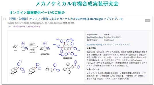 メカノケミカル有機合成を社会実装する目的で2024年4月に発足しております(以下、会則抜粋)。企業様のメカノケミカル有機合成技術導入の手助けとなればと考えております。一例の資料も下に添付しますが、多くの論文の要約や使用機器、例などを示しており、企業様には、「辞書」代わりにお使い頂けると非常に幸いです。
