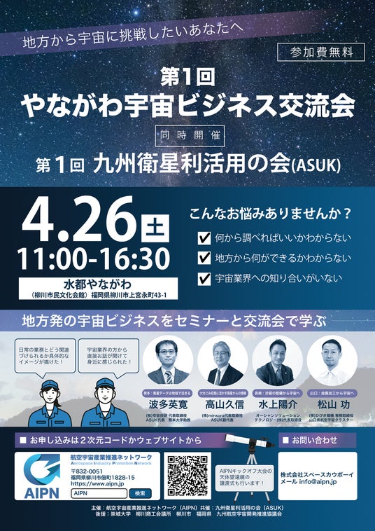 本セミナーは、民間による航空宇宙産業の推進を目指すコンソーシアム「航空宇宙産業推進ネットワーク(AIPN)」が主催し、共催には、衛星データの利活用による宇宙産業の発展を推進する「九州衛星利活用の会(ASUK)」が務めます。