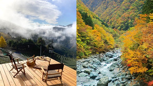 左:天空の川根茶体験 右:紅葉に染まる早川渓谷
