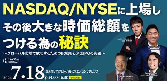 米国上場支援に特化したIPOコンサルティングを提供するHeartCore Financial, Inc.(東京支店:東京都千代田区、取締役:神野 純孝)は、米国上場を目指す日本企業向けセミナー「NASDAQ/NYSEに上場しその後大きな時価総額をつける為の秘訣~グローバル市場で成功するためのIR戦略と米国IPOの実践~」を2024年7月18日(木)14:00-16:30、東京虎ノ門グローバルスクエアコンファレンスに於いて参加無料で開催いたします。