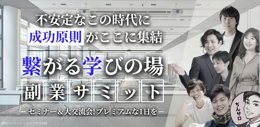 副業を頑張りたい人を全力で応援!さまざまな事業で成果を出してきた実績者が集結。副業を通して選択肢を増やし人生に彩りを与えられるサミットを開催します。講演後は交流会も実施。