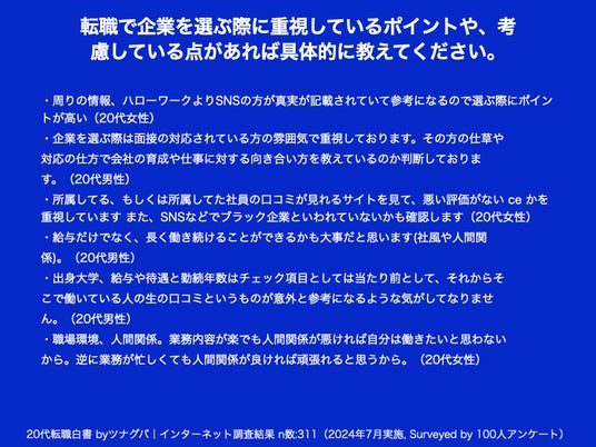 20代の転職者が企業を選ぶ際に重視するポイントや考慮する点について、SNSや口コミを参考にする傾向、給与や待遇、職場環境などの具体的な意見を集めました。