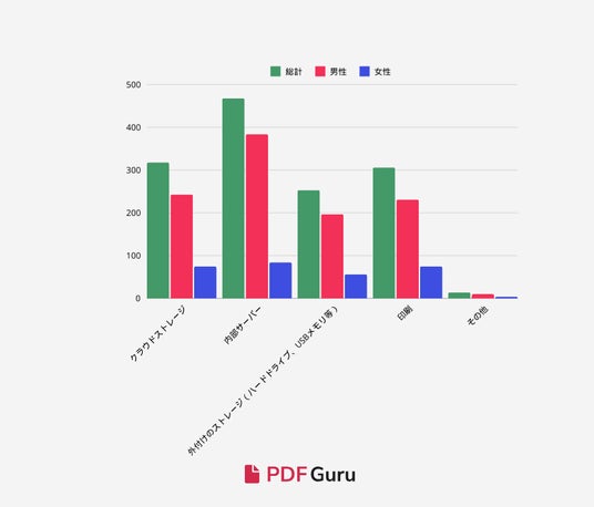 - 約79%がデジタルで文書を保存・共有しているものの、多くはクラウドストレージを使用せず、USBや外付けハードドライブ、印刷物などの手段を好むようです。
