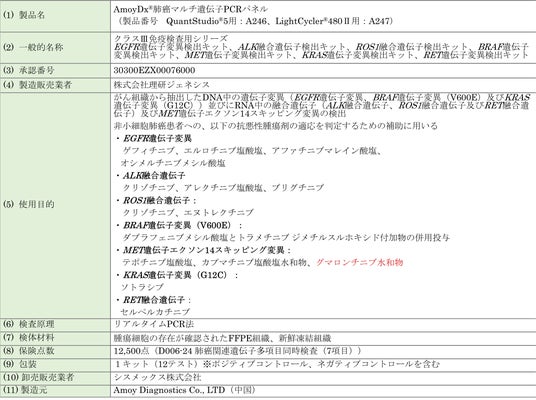 株式会社理研ジェネシス(本社:東京都品川区、代表取締役社長:岩壁 賢治、以下、「理研ジェネシス」, https://www.rikengenesis.jp/ )は、2024年7月19日付で、複数の抗悪性腫瘍剤に対するコンパニオン診断薬※1である体外診断用医薬品「AmoyDx(R)肺癌マルチ遺伝子PCRパネル(以下、「本製品」)」の製造販売承認事項一部変更承認(以下、「一部変更承認」)を取得したことをお知らせします。