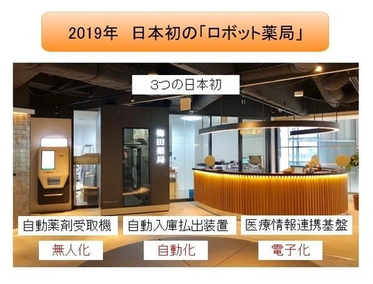 ロボット薬局とは、ロボティクス・ICT・AIを活用することによって「待ち時間ゼロ」「調剤ミスゼロ」を実現した次世代型の薬局です。日本独自の仕様である計数調剤に対応し、1.自動入庫払出装置(調剤の自動化)2.医療情報の電子化による連携(処方せんの電子化)3.自動薬剤受取機(投薬の無人化)ーーの「3つの日本初」を実現しています。また、