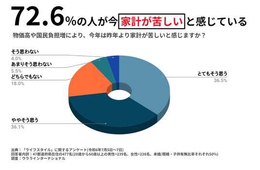 アンケートによると、72.6%の回答者が今年は「昨年より家計が苦しい」と答えており、足元の物価高による消費者心理への影響が浮き彫りになっています。(とてもそう思う=36.5%、ややそう思う=36.1%)