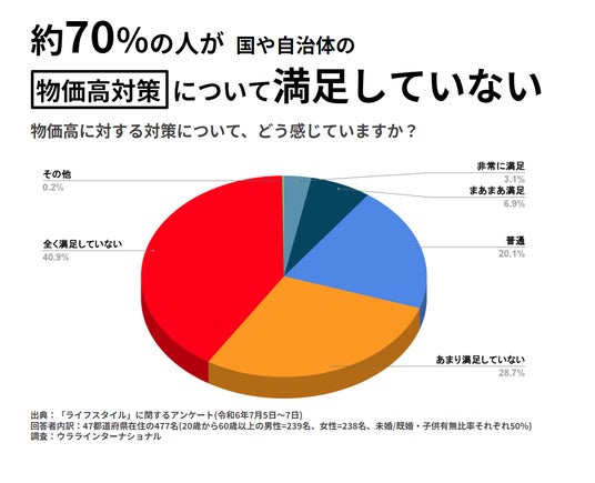 また、国や自治体等公的機関による物価高対策については、約70%の人が満足していないと回答しました。(全く満足していない=40.9%、あまり満足していない=28.7%)