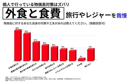 個人で実施している物価高対策は「外食を控える(50%の人が該当すると回答)」、「家庭の食材費を抑える(45%)」、「飲み会や会食を控える(30.6%)」との回答が最も多く、食費を削って倹約に務める人が多いことが明らかになりました。