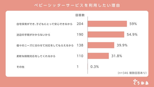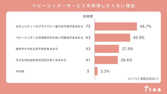 それに対し「所属企業がベビーシッターサービス利用料を補助してくれる場合、サービスを利用したいか」という質問に対しても同じく30%が利用したくないと回答しています。理由は、「セキュリティーやプライバシー面での心配」や「ベビーシッターの相性が合わない可能性があるから」などがあります。