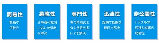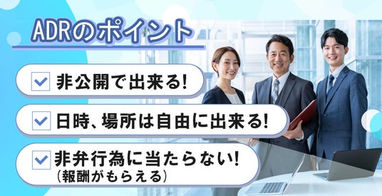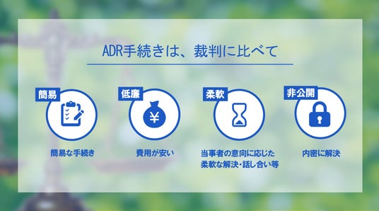 ADRは5つの特徴「簡易性」「柔軟性」「迅速性」「専門性」「非公開性」があるのですが、こちらでは特にここがポイントだと思う所をピックアップしてお届けいたします。