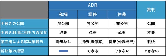 裁判では手続きの公開をしないといけませんが、ADRでは手続き、解決の過程、結果を非公開で行えます。