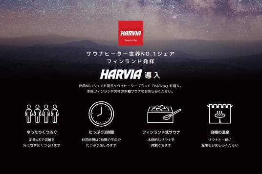 今回オープンしたサウナルームには、1950年にサウナの本場フィンランドで創業したサウナヒーター世界No.1ブランドのHARVIA(ハルビア)を導入し、本格ロウリュ式の熱気あるサウナをお楽しみいただけます。
