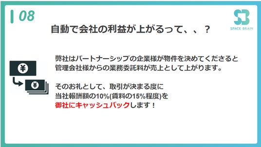 物件が決まるたびに管理会社様からの業務委託料が発生し、その一部をキャッシュバックとして企業様に還元します。