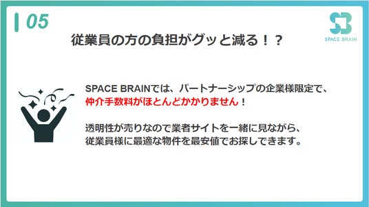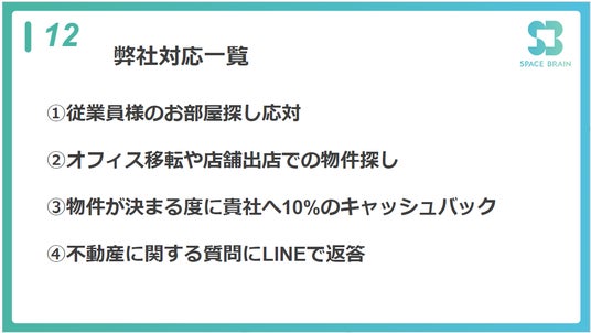 従業員様のお部屋探しからオフィス移転、店舗出店の物件探しまで幅広くサポートいたします。物件が決まるたびに企業様にキャッシュバックがあり、LINEでの質問対応も行っています。