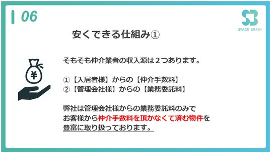これにより、入居者様から仲介手数料を頂かない物件を多数取り扱うことが可能となり、コスト削減に貢献します。