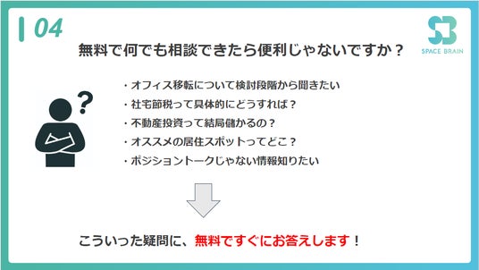 そんな時、私たちSPACE BRAINが無料で相談に応じます。オフィス移転や社宅の節税、不動産投資についてなど、どんな質問にも専門知識を持ったスタッフが迅速に対応します。