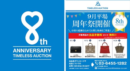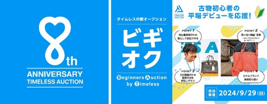 総合リユースサービス(オークション・総合買取サロン・古物商プラットフォーム)を展開する、株式会社タイムレス(本社:東京都港区、代表取締役社長:馬場 浩太)は、2024年9月で8周年を迎えるTIMELESS AUCTIONの「8周年プロジェクト」を実施します。その第2弾として、古物初心者のデビューを応援する新オークションである「Beginners Auction by TIMELESS」通称「ビギオク」を浜松町にて9月29日(日)に初開催いたします。