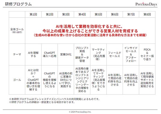 中小企業の営業支援を手掛けるプレシャスデイズ株式会社(本社:東京都中央区、代表:増山 順一)は2024年7月24日(水)より、東京大学松尾研発スタートアップの株式会社パンハウスと共同開発した中小企業の営業力向上に特化した生成AI導入研修サービスを開始いたします。