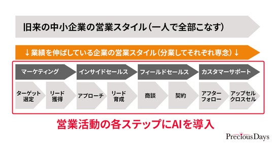 当社ではまず、この旧来の営業スタイルを棚卸して業務を細分化し、各ステップでどのようにAIを活用すれば業務効率化と売上アップを両立させることができるのかテストを繰り返してきました。