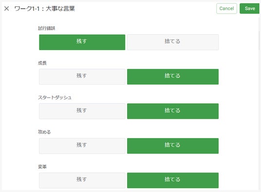 本プログラムのワークはすべて参加者専用のアプリで実施します。60個ある言葉から自分の気に入った言葉を5つだけ残すワークを行い、自分の価値観を表す言葉を探します。