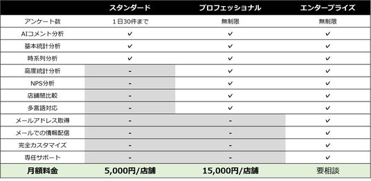 - プロフェッショナルプラン(月額15,000円/店舗):スタンダード機能に加え、高度統計分析、NPS分析、店舗間比較、多言語対応
