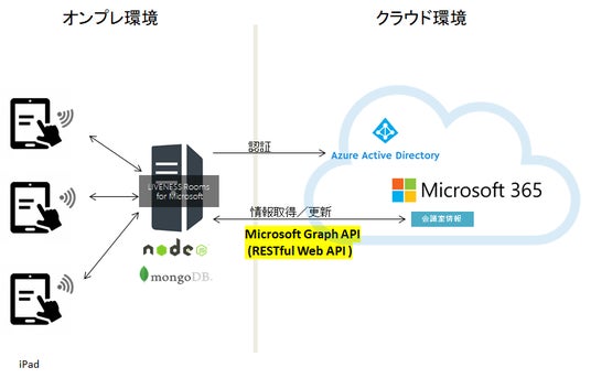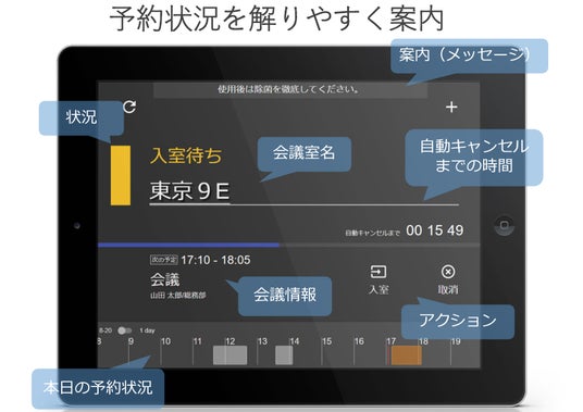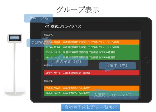 iPad端末で会議室予約状況をひと目で確認するシステムです。会議室の予約は今まで通り「Outlook」から行い、会議前になると予約情報を会議室前のiPad端末で確認できます。