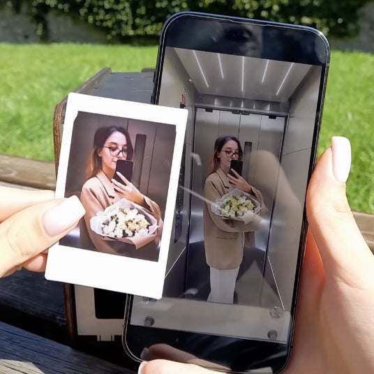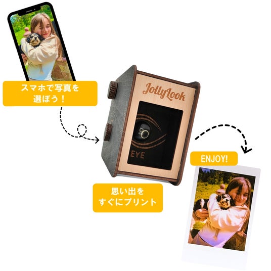 フォトプリンター「JollyLook EYE」は、電源や電池も不要、スマホをアプリに入れる必要もありません。必要なのは、スマホとインスタントフィルム(instax mini)だけ。プリントしたい写真を表示したスマホの画面の上に「Jolly Look EYE」を置き、シャッターを押して画面を撮影するだけで、すぐにデジタル写真がアナログフィルム写真としてプリントできます。