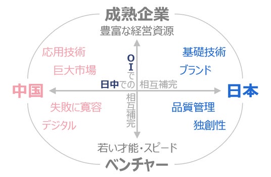 日中それぞれの強みはオープンイノベーションにおいてさらに相互補完の関係にあり、地理的に近くまた市場も大きく、相互連携により日中イノベーション共創を実現。