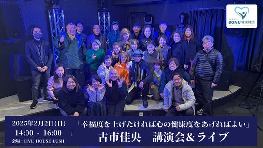 公益財団法人BOMU健康財団による講演会は年4回程度の開催となっておりますが、2月の講演会「幸福度を上げたければ心の健康度をあげればよい」は古市佳央氏によるお話と歌(ライブ)という、いつもとは少し異なるスタイルでの開催。