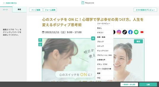 「ヨヤクー」は、個人起業、セミナー講師やフリーランス、副業を行うビジネスパーソンを対象に、オ ンラインビジネスを簡単、低コストで実現するために設計されたオールインワンプラットフォームです。ノーコードでのランディングページ(LP)作成やオンライン決済機能、申し込みフォーム作成のほか、自動メール配信など業務効率化の機能を、月額1,480円(税込)から提供いたします。