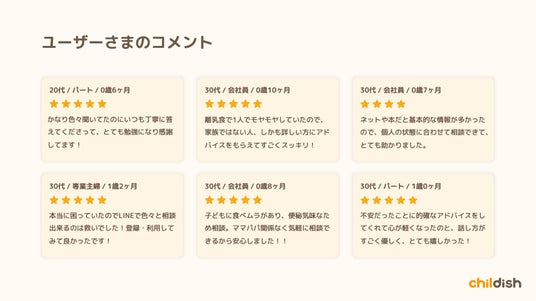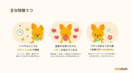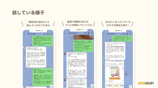 『チルディッシュ』は離乳食をはじめとした子育てのいろいろな悩みを、LINE上で相談することができます。月額500円で、チャット・画像・動画を使って、相談し放題。ママパパが抱える想いや不安を、どれだけ些細なことも、一緒に喜びたいことも、チルディッシュで話すことができます。