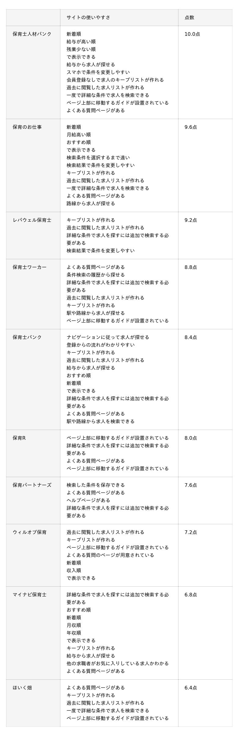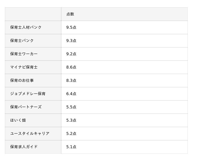 求人数を評価する際は保育求人が多い転職サイトを10点として、保育求人が少ないほど点数を低く設定しています。