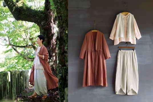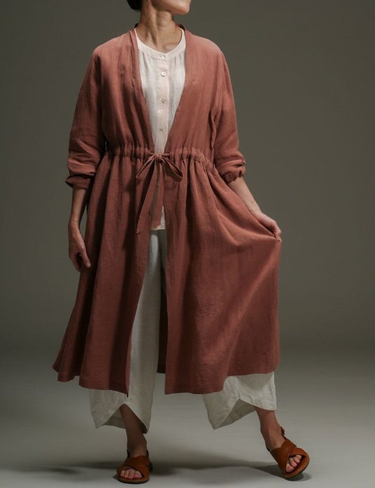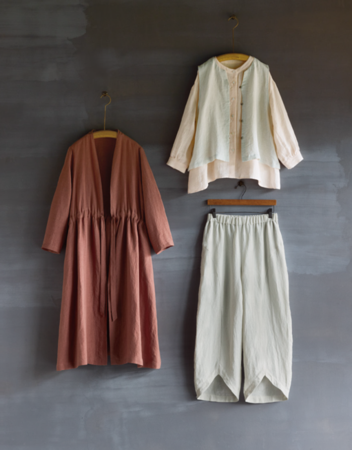 リネンパレットローブワンピース 色:はいあか(染料:山桜)、リネンボイルパレットギャザーブラウス 色:さくらいろ(染料:山桜)