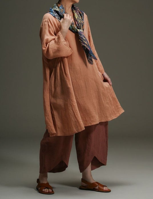 リネンボイルパレットチュニック 色:さんごいろ(染料:山桜)、リネンパレットコクーンパンツ 色:はいあか(染料:山桜)