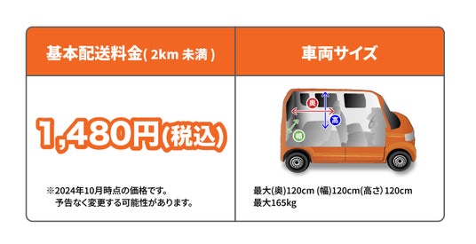 今回の新しい小型軽貨物車でサービスにより、中小企業は食品やお弁当、書類、小型部品など少量且つ軽量の荷物を安価に配送サービスを利用することができるようになります。配送基本料金は距離に応じた価格で、2km以内1,480円で、2kmから15kmまでは1km毎150円の追加料金、15km以上は1km毎80円の追加料金で利用することができます。ユーザーは、webもしくはアプリより配送元と配送先を指定するだけで近くの配達パートナーと数分でマッチングし、即時配送を実現することができます。(予約便も可能)
