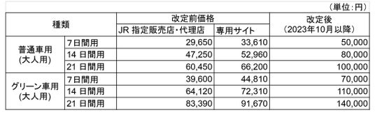 出典:「『ジャパン・レール・パス』の商品内容の拡充および価格改定等について|東日本旅客鉄道株式会社|2023.4.14」を基にFast Train Mediaが作成した表|