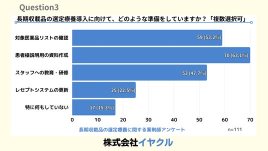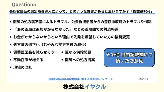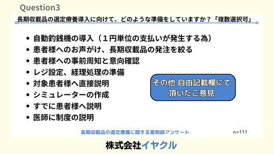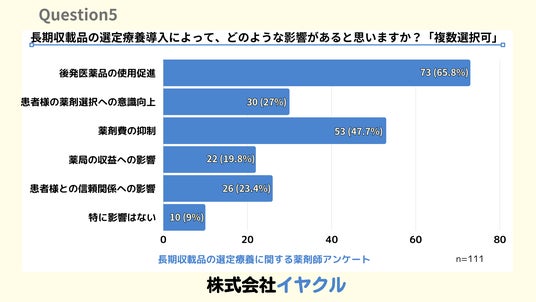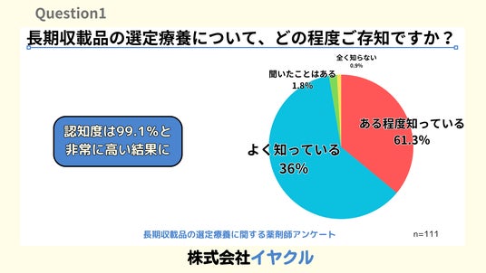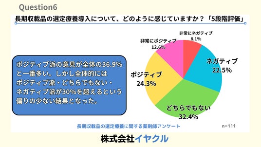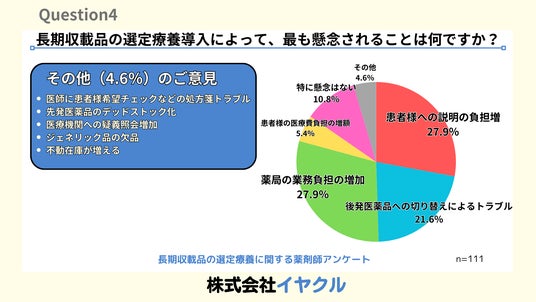株式会社イヤクル(本社:北海道枝幸郡浜頓別町、代表取締役:佐孝尚)は、2024年10月1日から導入される選定療養制度に関して、株式会社イヤクルの医薬品ロス解消プラットフォーム「イヤクル」ユーザーと株式会社APOSTRO、株式会社ネグジット総研、株式会社Kaeマネジメントの4社合同による薬剤師を対象にした意識調査を実施しました。この調査には111名の薬剤師が参加し、選定療養制度に対する理解度や制度導入に伴う業務への影響が明らかになりました。本調査では、患者負担の増加や薬剤師の業務負担が懸念される一方、医療費の抑制と後発医薬品の使用促進に対する期待も浮き彫りになりました。
