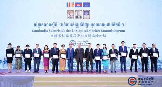 カンボジア資本市場フォーラムで、受賞者全員が壇上で記念撮影。各界のリーダーたちがカンボジアと国際社会の経済連携を強化する功績を称えられた。