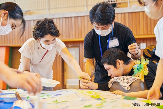 本ワークショップは、総勢185名の子どもたちが参加し、特別支援学校と下妻市内の小・中・高等学校の子どもたちによる混合チームで、1 つの作品をつくる取り組みで、下妻地域の夏祭りで親しまれる「千人おどり」をモチーフに、チーム内でアイデアを出し合い、大きな布に「踊る人」を描きました。肢体不自由や知的障害のある子どもたちと、どうしたら一緒に楽しく描くことができるのか、チームで考え、様々な絵の具やペイントアイテムを使って、工夫しながら製作しました。