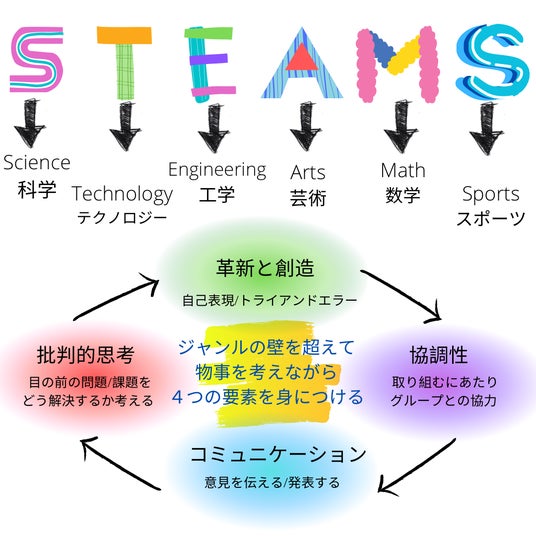 STEAMSのSはScience(科学)、TはTechnology(技術)、EはEngineering(工学)、AはArts(芸術)、MはMath(数学)そしてSはSports(スポーツ)です。理想は、これらのジャンルまたは科目を超えて一緒に教えていくことですが、現在の日本教育においてほとんどの学校では時間割を見てもわかるように科目別に教えられています。できることなら幼少期からジャンルを超えて学びの中から楽しさ、発見するワクワクを体感してほしいと思っています。創造性を育むアートの要素を必ず取り入れ、イノベーションを促進するアイデアや発見が生まれやすいAI時代を生き抜く源である「ひらめき」を刺激するのがアート中心のSTEAMS教育です。プロジェクトベースのアクティビティや実践的な学びを通じて子供達に「アハ体験」をもたらします。