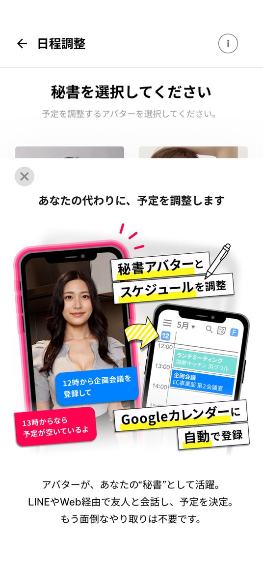 日程調整機能先日Castalkに新搭載された「日程調整機能」が、森咲智美アバターにも実装されます。「日程調整機能」は、ユーザーのGoogleカレンダーと連携し、AIアバターがスケジュール調整を代行する機能です。ユーザーはアプリ上で専用の日程調整用リンクをワンタップで発行し、ゲスト(友人・取引先など)に送るだけ。ゲストはLINE公式アカウントまたはWEBページを通じて、秘書アバター”とやりとりしながら最適な日時を決めることができ、確定した予定はGoogleカレンダーに自動登録されます。まるでユーザー専属の“秘書”のように、日程の候補を会話の中で引き出し、空き状況と照らし合わせたうえでスムーズに予定を確定させることが可能です。