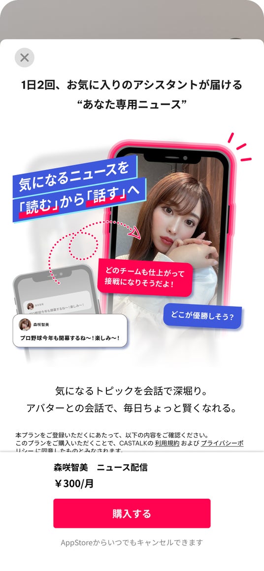 株式会社CASTALK(所在地:東京、代表取締役:戸叶悠莉菜)が提供するAIアバターとのビデオチャットアプリ「Castalk(キャストーク)」に、元グラビアアイドルの森咲智美さんをモデルとしたAIアバターが5月7日(水)以降のアップデートより新たに登場します。CastalkのAIアバターへの、実名の著名人の起用は初となります。また、森咲智美さんのアバター実装を記念し、森咲さんのサイン入りスマホスタンドが当たるキャンペーンも実施します。