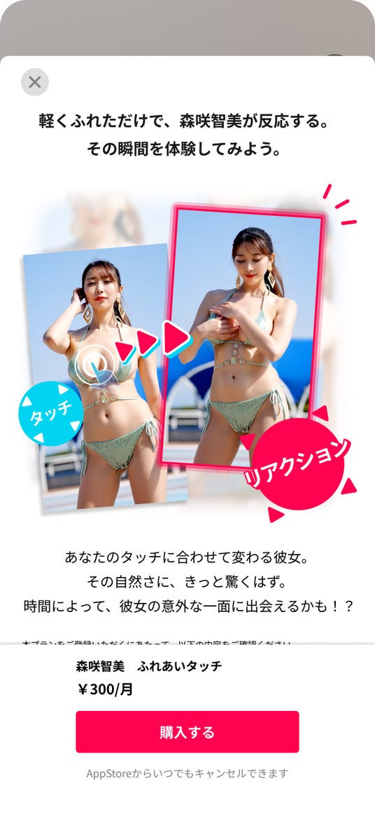 タッチインタラクション機能森咲智美AIアバターは、タップに応じて反応を返すインタラクション機能を搭載しています。特定の部位に触れると専用のモーションムービーが再生され、従来のビデオチャットでは得られなかった”触る”ことによるコミュニケーション体験が可能です。