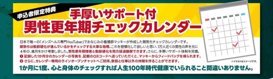 会場参加&希望者アーカイブ配信特典: 男性更年期チェックカレンダーが会場参加者全員とアーカイブ配信希望者に配布されます。このカレンダーには、男性更年期障害の症状を確認できる「AMSスコア」が含まれており、自宅で簡単にセルフチェックができます。また、主催者である看護師マッキーが月に1度フィードバックを行い、セルフチェックの習慣化を1年間サポートします。
