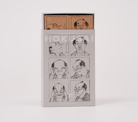 その第一弾を飾るのは、同じく墨田区が生んだ世界的浮世絵師・葛飾北斎。『北斎漫画』より「百面相」と「相撲」のユニークな図版を採用し、江戸の人々や暮らしを生き生きと描いた北斎の心豊かな表現力を、繊細なゴム印で再現しました。