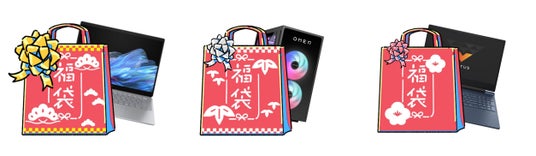 「HP新春大祭り」では、セール開始と同時に初売り福袋を販売します。福袋はノートパソコン、デスクトップパソコン、ゲーミングデスクトップPC、ゲーミングノートPCの4カテゴリー、「松・竹・梅」の各3種類。最大約43%オフ、約13万円引きのハイスペックなAI PCなどをご用意しました。「新春大祭り」の期間、福袋以外にもセール対象製品を複数扱っています。
