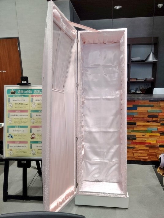 従来の横型の入棺体験では、「人前で実際に寝転がる」ことに心理的な抵抗を感じることがあります。一方、縦型入棺体験は、立ったままの自然な姿勢で体験できるため、棺に入ることへの抵抗感を軽減し、出入りもしやすいので高齢者の方も安心です。また縦型なので写真を撮りやすいというメリットもあります。