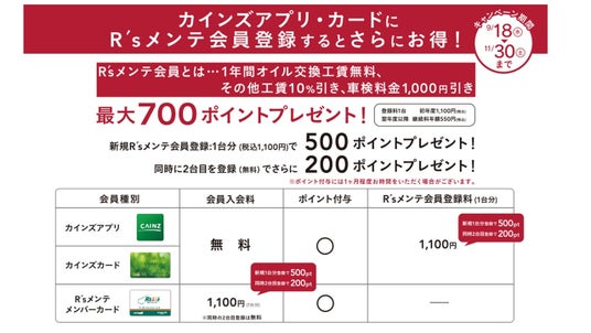 9月18日から11月30日まで、R’sメンテメンバーカード・カインズカード・カインズアプリに新規R’sメンテ会員の有料登録(税込1,100円)を行うことで500ポイント付与、2台同時の登録で200ポイント、最大700ポイントを付与致します。(2台目の同時登録は無料)