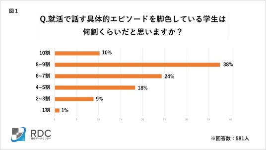 調査では、就職活動において学生がどの程度エピソードを脚色していると認識しているかを尋ねたところ、約半数に当たる48%の学生が「8割以上の学生が脚色している」と回答しました。「6~7割」と答えた学生と合わせると、72%にも達しています。また、特に「8~9割」と答えた学生の割合は38%と、全体の1/3に達しています。(図1)